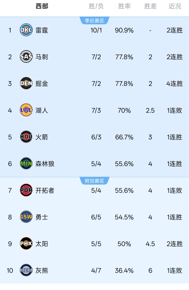 随着勇士成功复仇步行者,火箭逆转击败雄鹿,NBA西部最新排名出炉,雷霆继续领跑,湖人第4,火箭第5,勇士第8。